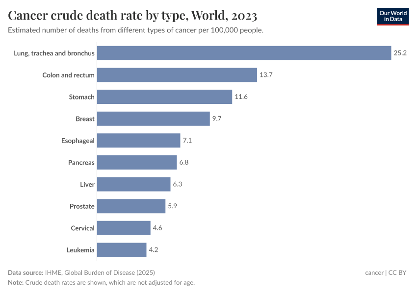 The chart below shows the cancers with the highest death rates globally.