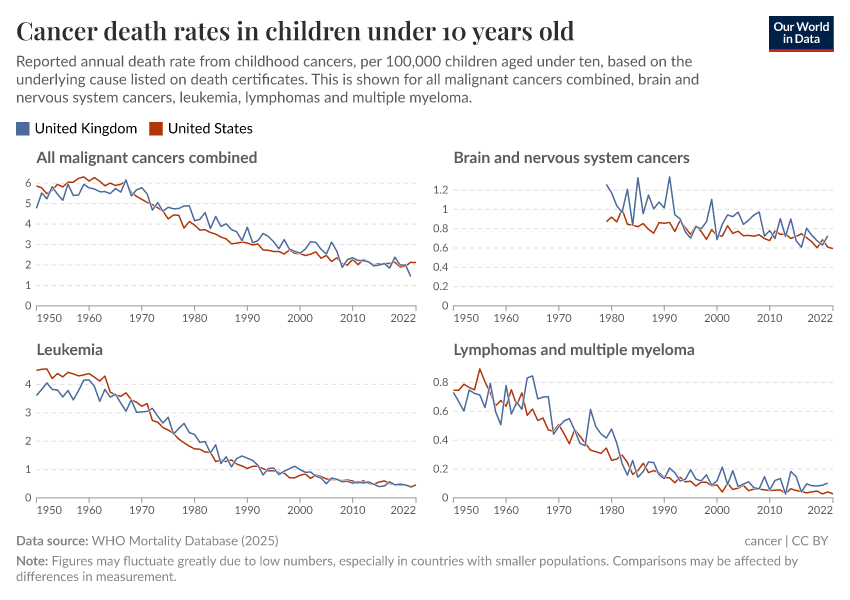 The chart below shows this. There have been declines in cancer death rates across age groups, but especially among children.