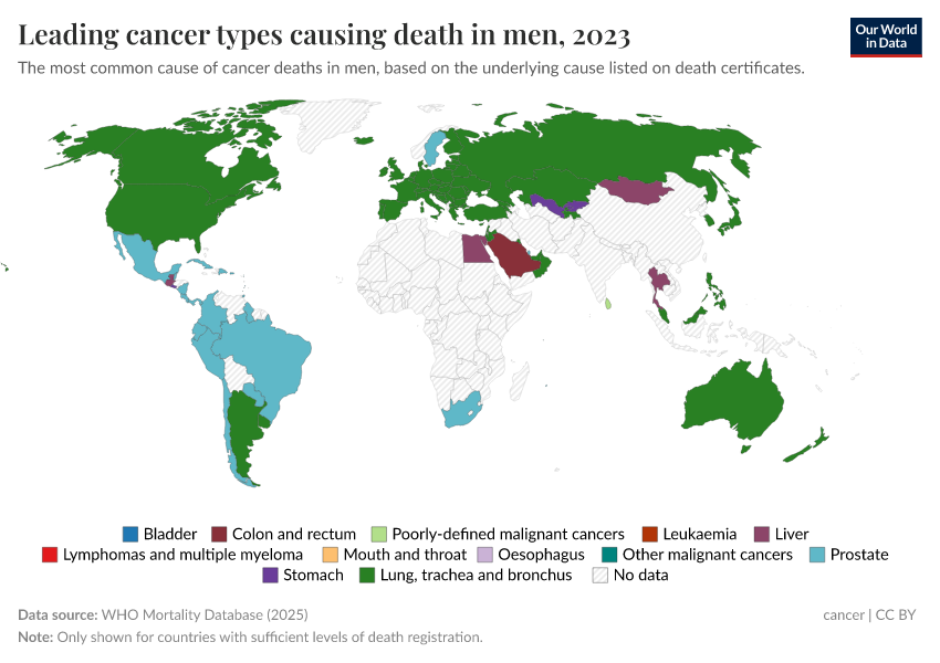 In men, you can see that lung cancer kills the most in many countries. Other cancers — such as prostate, liver, and stomach cancer — are the most common in others.
