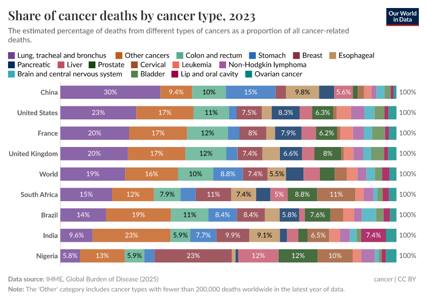 The share of cancer deaths from each type varies between countries. You can explore an interactive chart for different countries showing the relative share of all cancer deaths from each cancer type here: