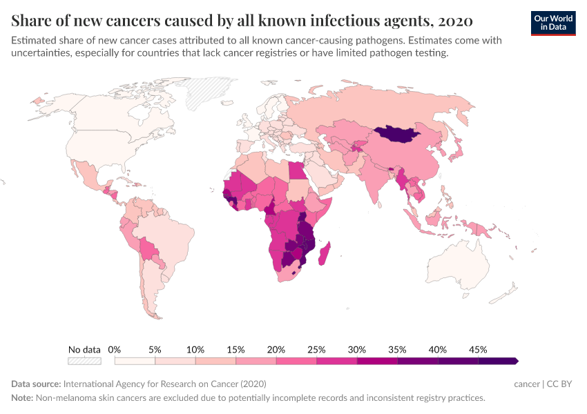 The map below shows that the share of cancers caused by infections varies widely worldwide — with around a quarter of cancer cases caused by infections in many African countries versus less than 10% in many European countries and North America.