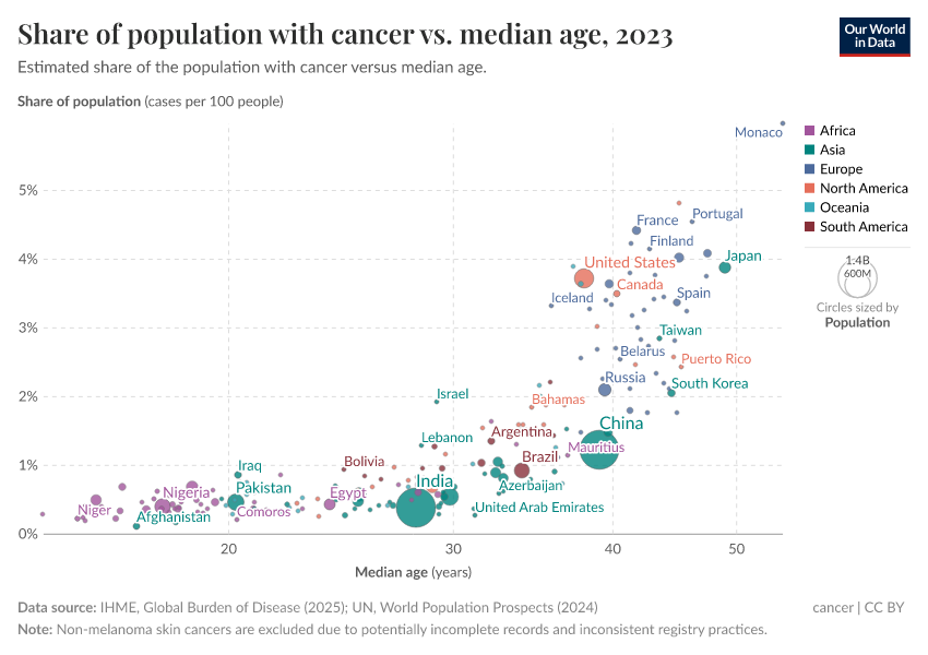 These factors mean that countries with older populations tend to have a higher prevalence of cancer. This is shown in the chart below.