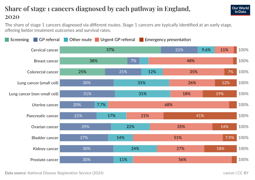 The chart below shows these pathways to diagnosis in England. As you can see, a significant share of stage 1 cases of cervical, breast, and colorectal cancer, are detected during screening in England. For others, most stage 1 cases are diagnosed during general practitioner (GP) referrals or other routes.