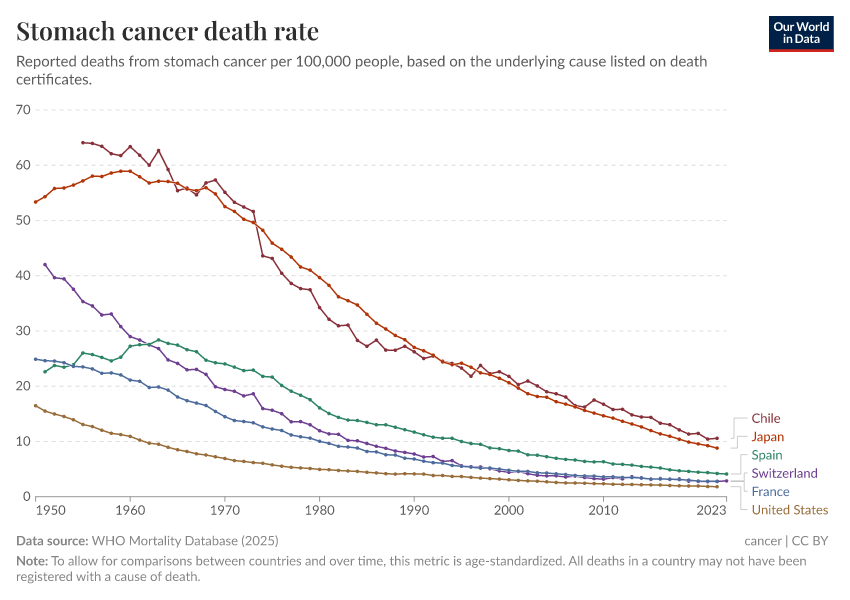 It’s likely that stomach cancer declined without specific interventions but rather over time due to general improvements in clean water and sanitation, food safety practices, antibiotics, and hygiene.3