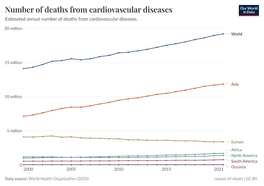 In 2000, around 14 million people died from cardiovascular diseases globally, while in 2019, close to 18 million died.