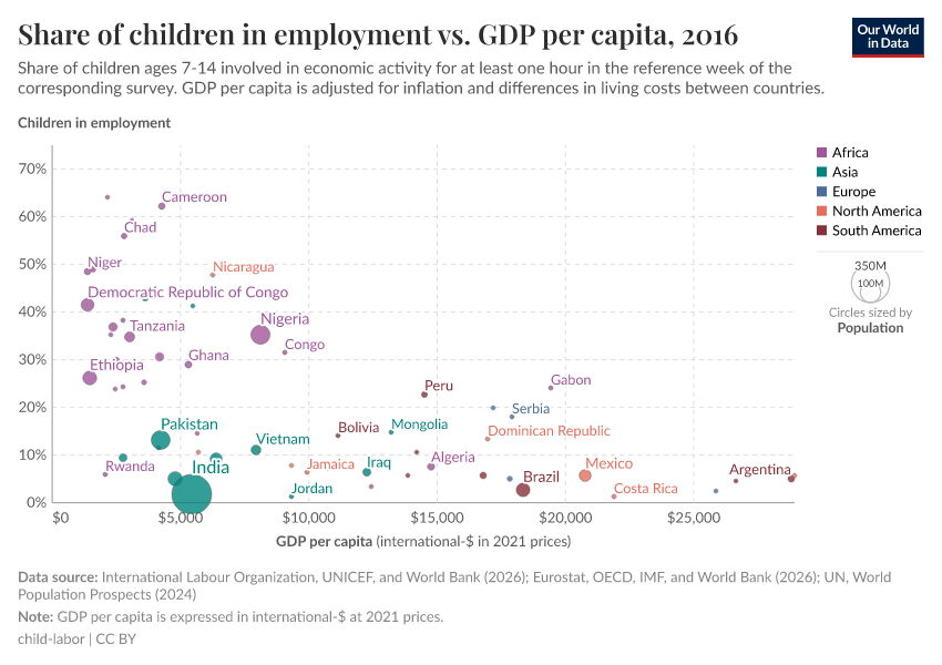 The visualization depicts the cross-country incidence of child labor (share of children aged 7-14 involved in economic activity) against GDP per capita. To provide some context regarding the absolute number of children, each country's observation is pictured as a circle where the size of the circle represents the population aged 5-14.