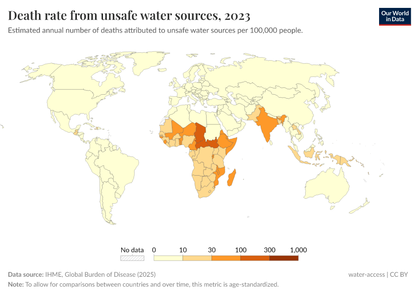 This map shows the death rates from unsafe water sources worldwide. Death rates measure the number of deaths per 100,000 people in a given country or region.