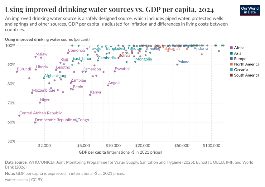 Typically, most countries with more than 90% of households with improved water have an average GDP per capita of over $10,000 to 15,000. Those at lower incomes tend to have a larger share of the population without access.