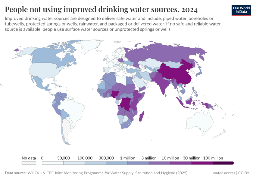 The map shows the number of people worldwide who do not use improved water sources.