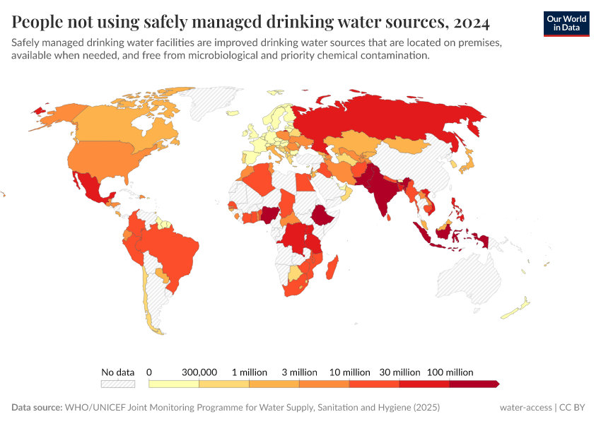 The map shows the number of people worldwide who do not use safe drinking water facilities.