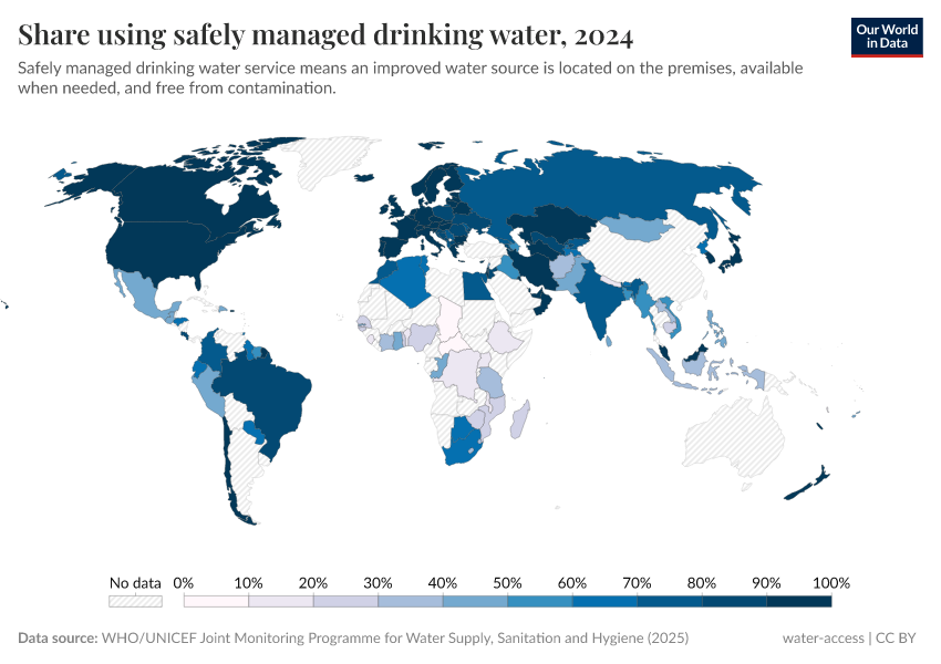 In the map shown, we see the share of people worldwide using safe drinking water facilities.