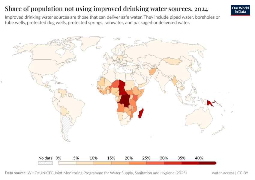 The map shows the share of people worldwide who do not use improved water sources.