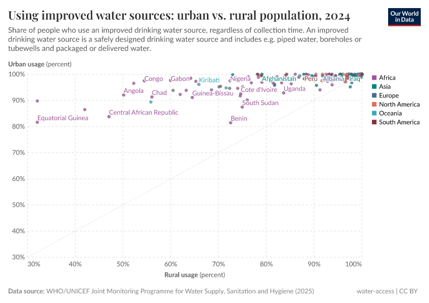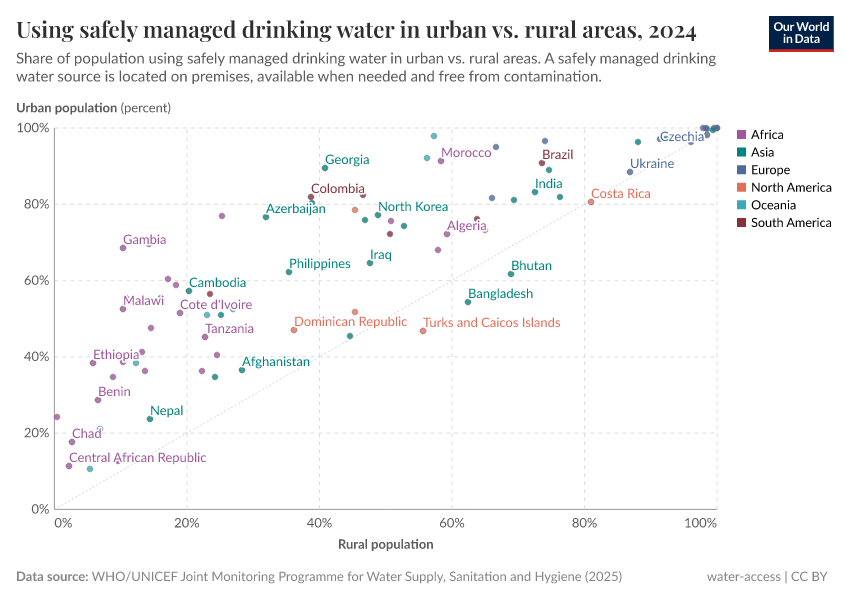 In addition to the significant inequalities in improved water usage between countries, there can also be large differences within countries. In the charts, we plotted the share of the urban versus rural population using improved water sources and safely managed drinking water, respectively. Here, we have also shown a line of parity; if a country lies along this line, then access in rural and urban areas is equal.