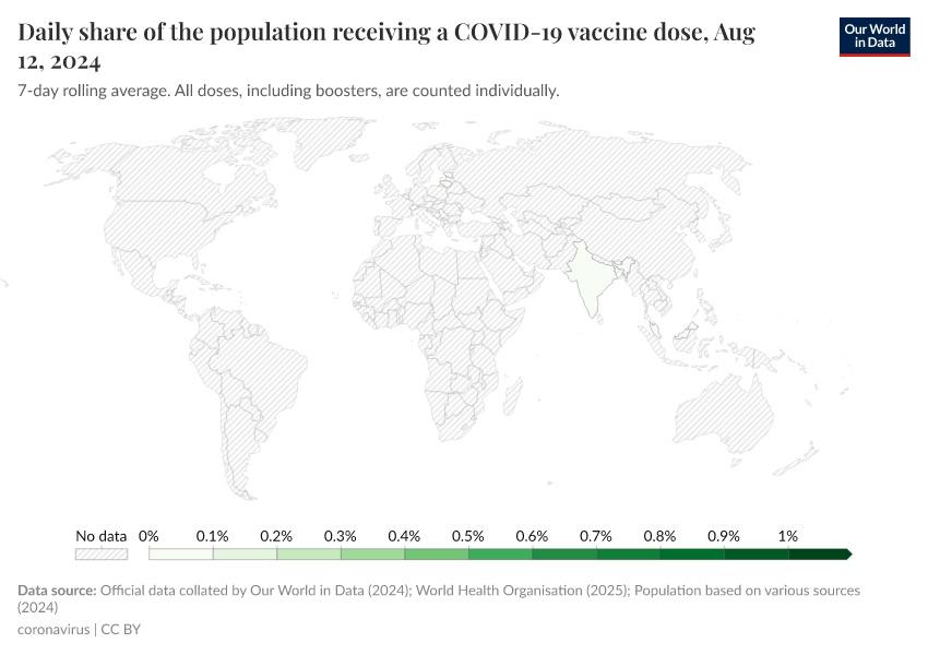 The following chart shows the share of people receiving a COVID-19 vaccine dose. This is shown as a seven-day rolling average.