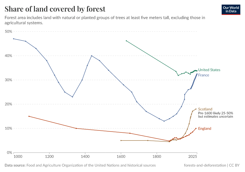 One thousand years ago, 20% of Scotland’s land was covered by forest. By the mid-18th century, only 4% of the country was forested. But then the trend turned, and it moved from deforestation to reforestation. For the last two centuries, forests have been growing and are almost back to where they were 1000 years ago.13