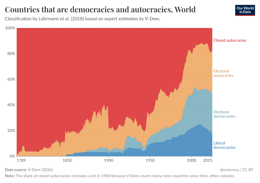 On this page, you can find data, visualizations, and writing on how democracy has spread across countries, how it differs between them, and whether we are moving towards a more democratic world.