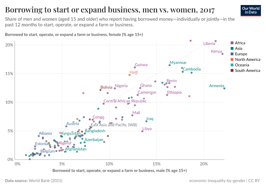 Above we show that there are large gender gaps in land ownership across low-income countries. Here we show that there are also large gaps in terms of access to borrowed capital.