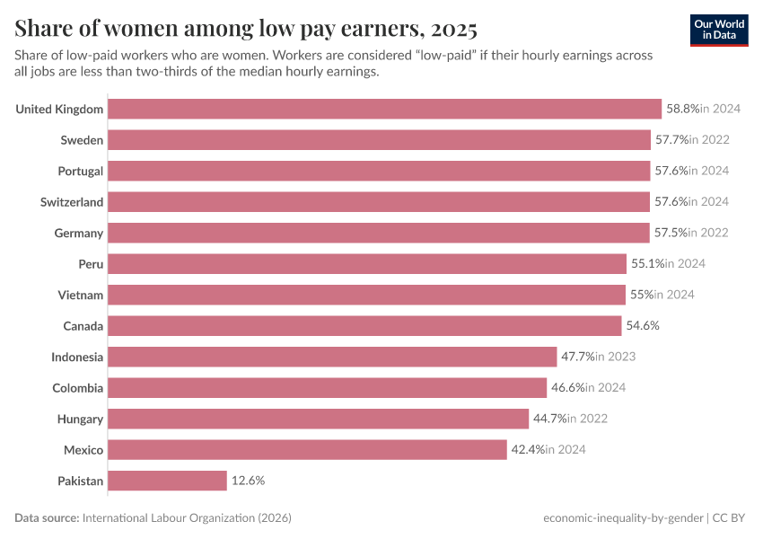 Above we show that women all over the world are underrepresented in high-profile jobs, which tend to be better paid. As it turns out, in many countries women are at the same time overrepresented in low-paying jobs.
