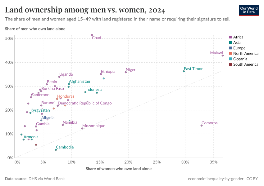 Economic inequalities between men and women manifest themselves not only in terms of wages earned but also in terms of assets owned. For example, as the chart shows, in nearly all low and middle-income countries with data, men are more likely to own land than women.