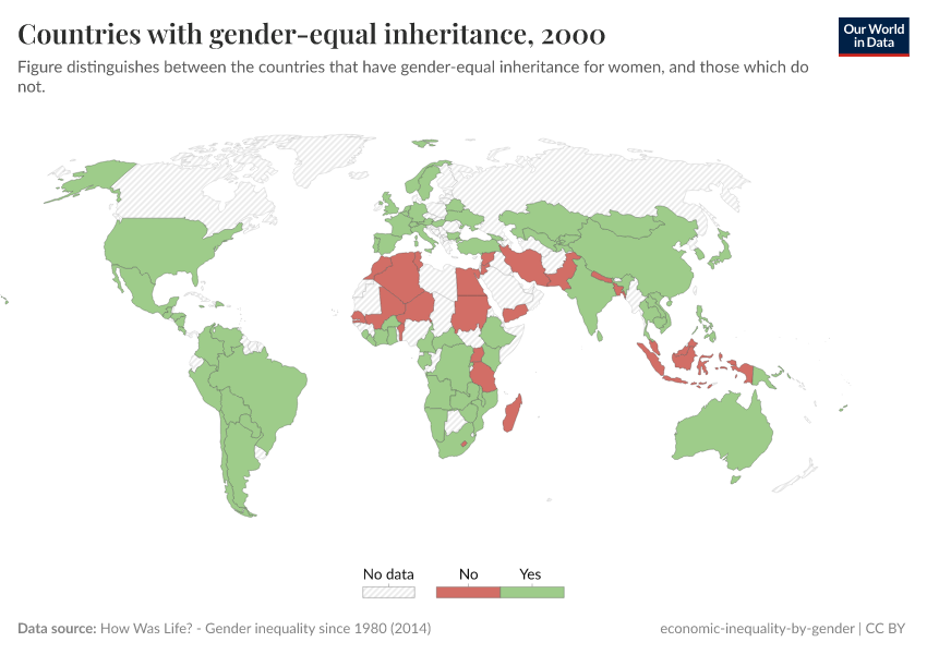 Inheritance is one of the main mechanisms for the accumulation of assets. In the map, we provide an overview of the countries that do and do not have gender-equal inheritance systems.