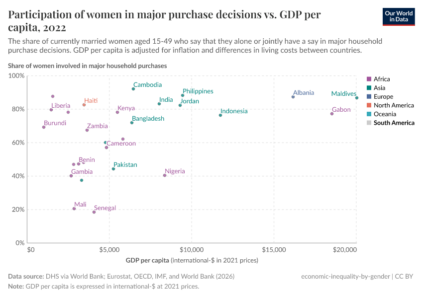 In this chart, we plot the share of currently married women who report having a say in major household purchase decisions, against national GDP per capita.