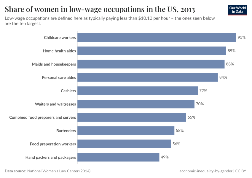The fact that women in rich countries are overrepresented in the bottom of the income distribution goes together with the fact that working women in these countries are overrepresented in low-paying occupations. The chart shows this for the US.