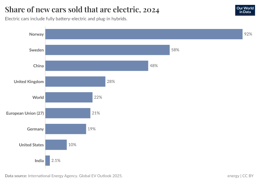 Globally, over 1-in-5 (22%) of new cars sold were electric in 2024. This share was 92% in Norway, and in China, it was almost 50%.