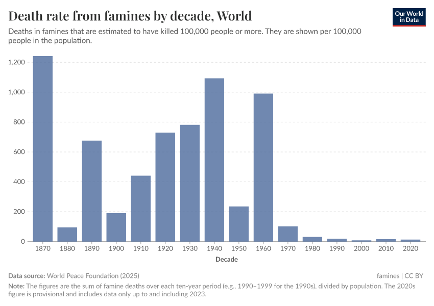 But while the number of deaths caused by individual famines is often subject to a good deal of uncertainty, the overall trend over time is very clear: compared to earlier historical periods, far fewer people have died in famines in recent decades.
