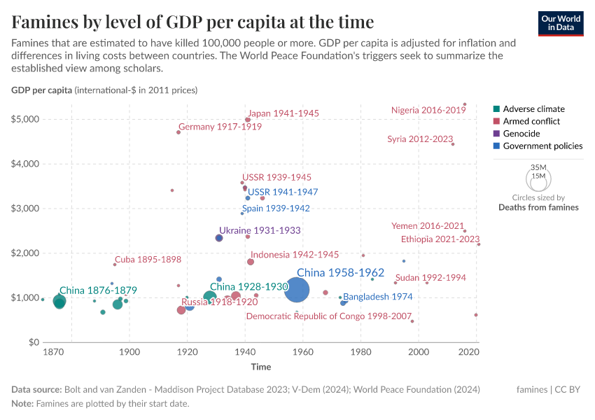 Our source, the World Peace Foundation, also identifies a main trigger for each famine. This data suggests that all famines in the slightly richer countries were not triggered by adverse climates, but human action in the form of bad government policies or armed conflict.