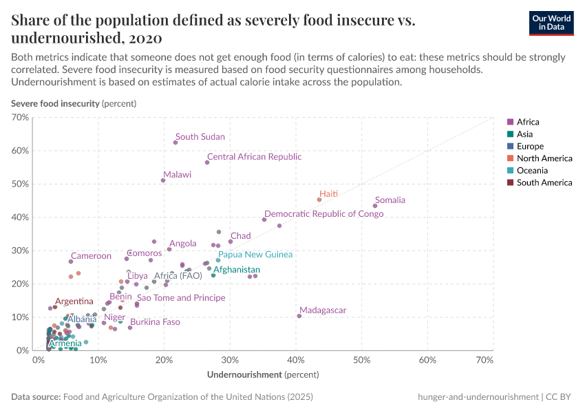 In the chart below we see the correlation between these two metrics: on the y-axis we have the prevalence of severe food insecurity, and on the x-axis we have the prevalence of undernourishment. If these estimates were identical, they’d lie along the diagonal gray line.