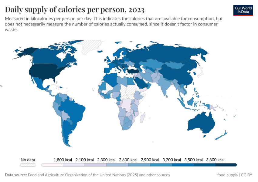 Max Roser, Hannah Ritchie, and Pablo Rosado (2013) - “Food Supply” Published online at OurWorldinData.org. Retrieved from: 'https://remove-datapage-tags.owid.pages.dev/food-supply' [Online Resource]BibTeX citation