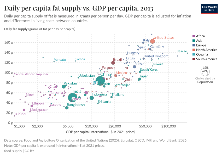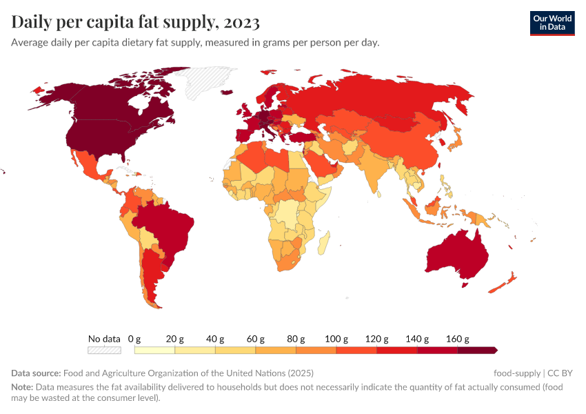 In this interactive map, we see the differences in how much fat each person gets every day in different countries.