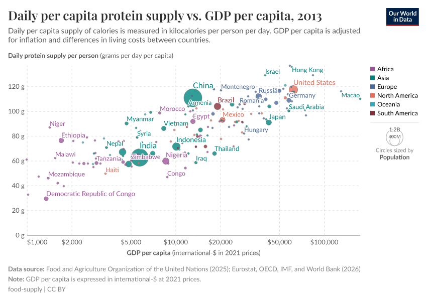 In the chart below we can see FAO estimates of per capita protein supply by region dating back to 1961. Overall, the global per capita protein supply has increased by approximately one-third over this period. The majority of this growth has occurred in Africa, Asia, and South America, where per capita protein supplies have been on the rise. Conversely, in Europe, Oceania, and North America, protein supply has more or less plateaued in recent decades.