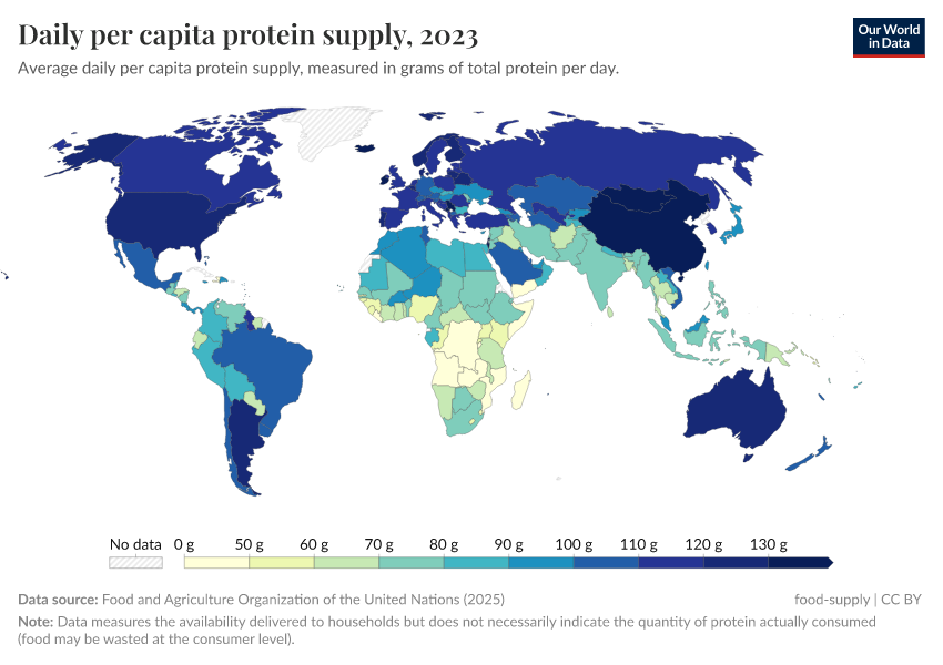 In this interactive map, we see the differences in how much protein each person gets every day in different countries.