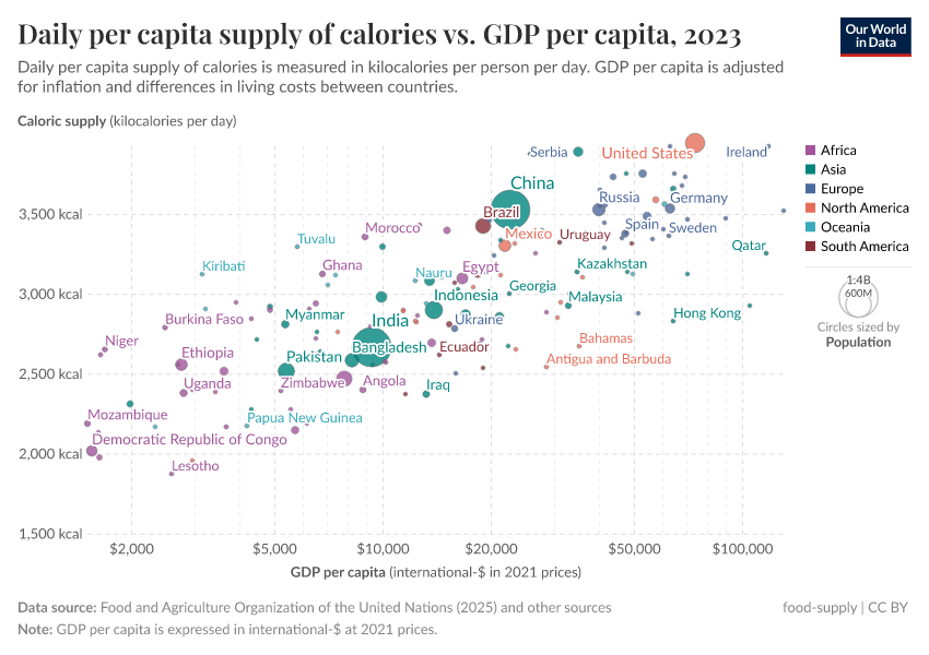 In the sub-sections below we have plotted the relationship between daily per capita food supply (in the form of calories, protein, and then fat) versus gross domestic product (GDP) per capita in 2011 international-$. Several countries selected across a range of income levels and global regions have been highlighted for comparison. For all three measures of food supply, we see a close correlation between per capita supply and prosperity. As we get richer, per capita supply tends to increase.