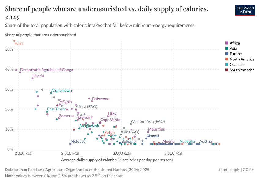 The link between increasing per capita food supply and the prevalence of undernourishment is an intuitive yet critical aspect of global nutrition dynamics. Undernourishment, as we cover in detail in our topic page Hunger and Undernourishment, is defined as a caloric intake insufficient to meet minimum energy requirements for adequate weight and nutrition.