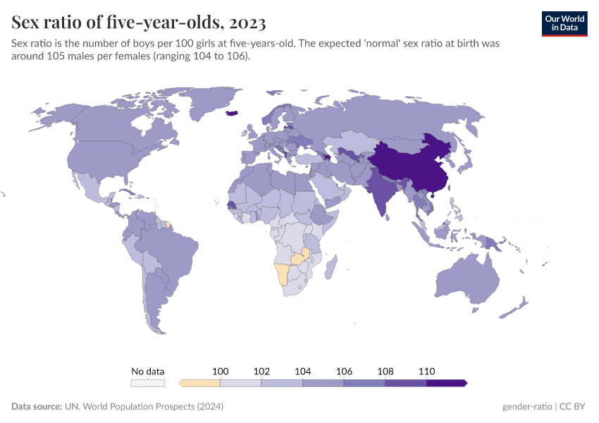 Most countries have a sex ratio at birth around the expected range of 105 boys born for every 100 girls.