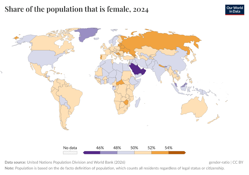 Countries over 50 percent (shown in orange) have a higher female population, while those below 50 percent (shown in purple) have a higher male population.