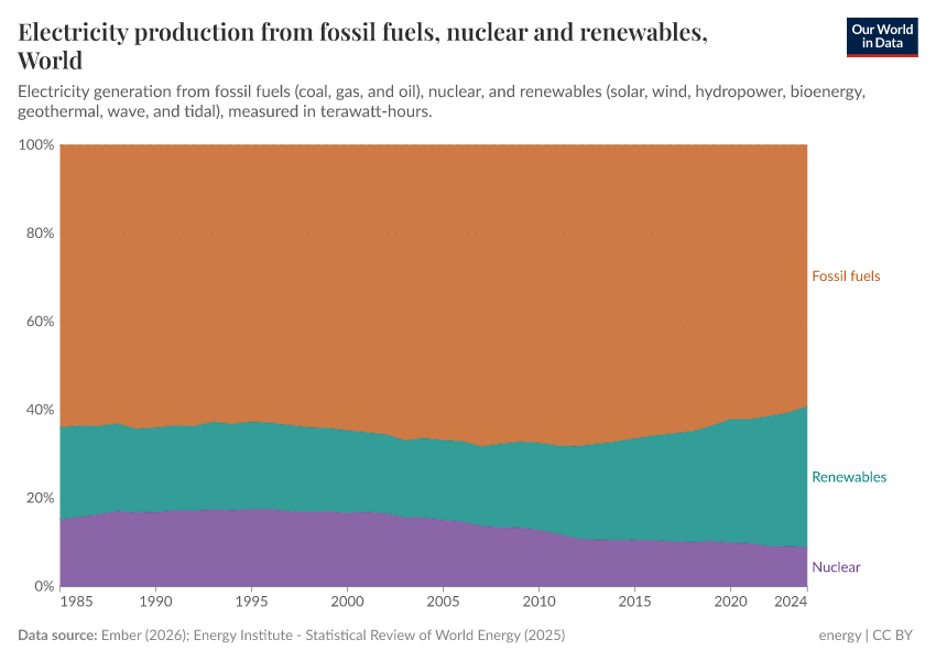 In the chart here we see trends in electricity production2 from renewable technologies, nuclear, and fossil fuels. These figures are given as the percentage contribution to total global electricity production.