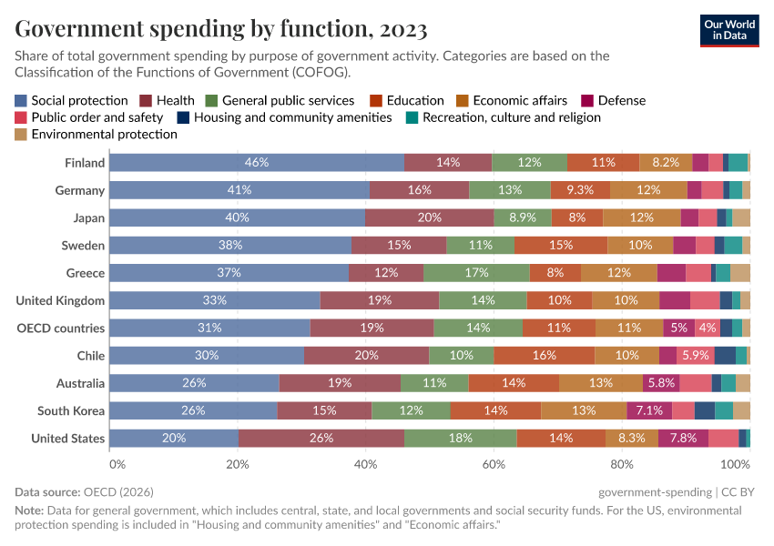 In the chart here we see the allocation of government spending (shown as a share of a country's GDP) across a range of “social spending” categories. Note that you can change which country is shown.