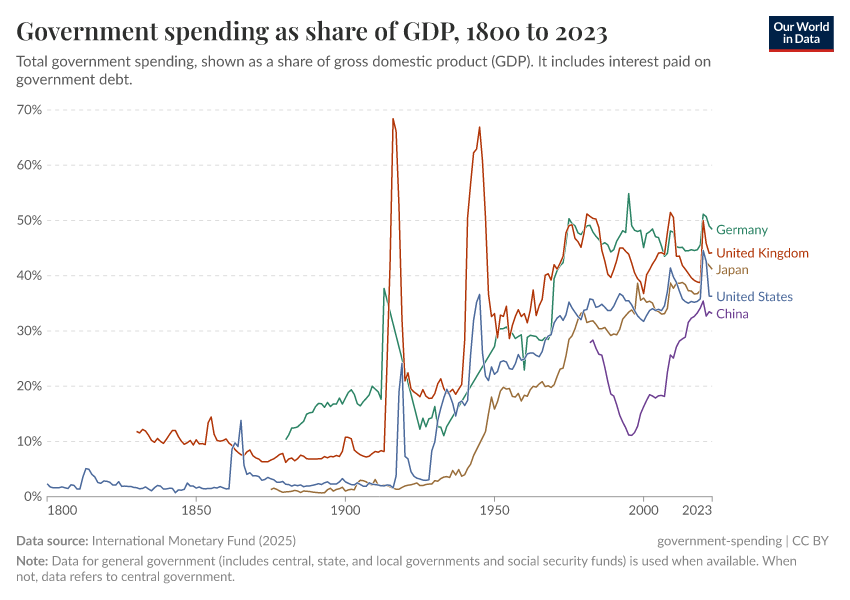 The visualization shows the evolution of government spending as a share of Gross Domestic Product (GDP), for a selection of countries over the last century.