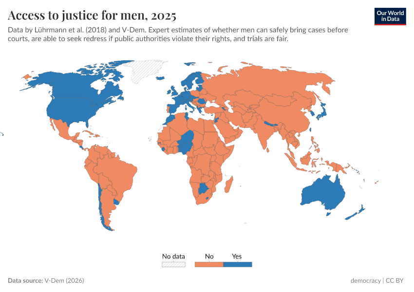 “Data Page: Access to justice for men”, part of the following publication: Bastian Herre, Lucas Rodés-Guirao, and Esteban Ortiz-Ospina (2013) - “Democracy”. Data adapted from V-Dem. Retrieved from https://remove-datapage-tags.owid.pages.dev/grapher/access-to-justice-men-row [online resource]How to cite this data