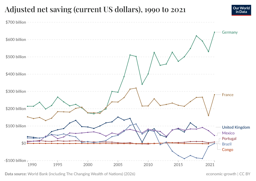 World Bank, The Changing Wealth of Nations (2011) (2025) – processed by Our World in Data. “Adjusted net saving (current US dollars)” [dataset]. World Bank, The Changing Wealth of Nations (2011), “World Development Indicators” [original data]. Retrieved June 26, 2025 from https://remove-datapage-tags.owid.pages.dev/grapher/adjusted-net-saving-current-us-dollars