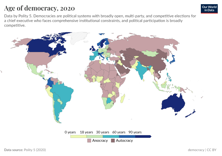 “Data Page: Age of democracy”, part of the following publication: Bastian Herre, Lucas Rodés-Guirao, and Esteban Ortiz-Ospina (2013) - “Democracy”. Data adapted from Polity 5. Retrieved from https://remove-datapage-tags.owid.pages.dev/grapher/age-of-democracy-polity [online resource]How to cite this data