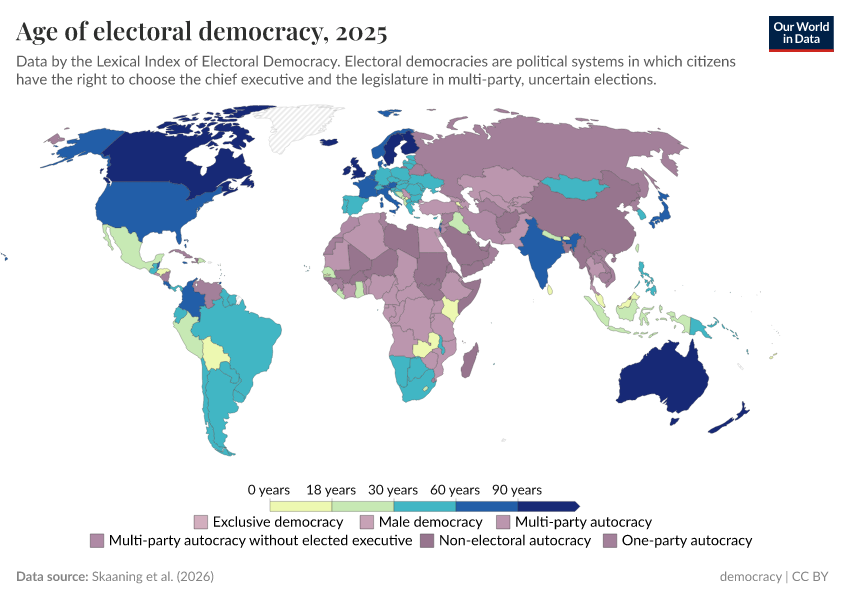 Skaaning et al. (2024) – processed by Our World in Data. “Age of electoral democracy” [dataset]. Skaaning et al., “Lexical Index of Electoral Democracy (LIED) v6.6” [original data]. Retrieved June 26, 2025 from https://remove-datapage-tags.owid.pages.dev/grapher/age-of-electoral-democracy-lexical