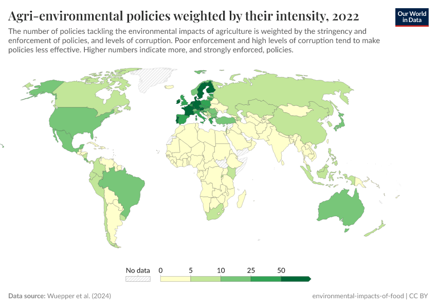 “Data Page: Agri-environmental policies weighted by their intensity”. Our World in Data (2025). Data adapted from Wuepper et al. (2024). Retrieved from https://remove-datapage-tags.owid.pages.dev/grapher/agri-environmental-policies-intensity [online resource]How to cite this data