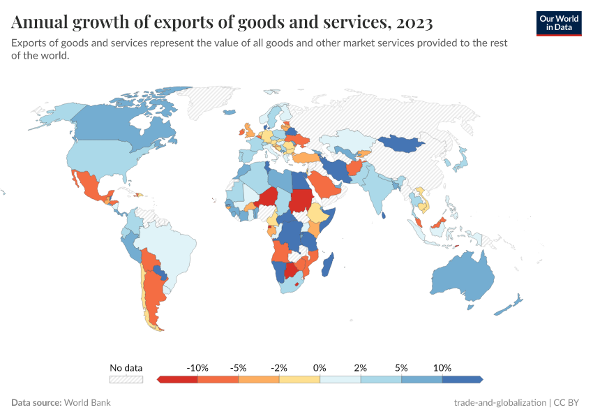“Data Page: Annual growth of exports of goods and services”. Our World in Data (2025). Data adapted from World Bank. Retrieved from https://remove-datapage-tags.owid.pages.dev/grapher/annual-growth-of-exports-of-goods-and-services [online resource]How to cite this data