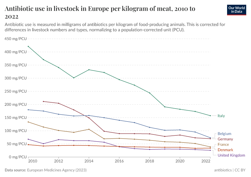“Data Page: Antibiotic use in livestock in Europe per kilogram of meat”, part of the following publication: Saloni Dattani, Fiona Spooner, Hannah Ritchie, and Max Roser (2024) - “Antibiotics and Antibiotic Resistance”. Data adapted from European Medicines Agency. Retrieved from https://remove-datapage-tags.owid.pages.dev/grapher/antibiotic-use-in-livestock-in-europe [online resource]How to cite this data