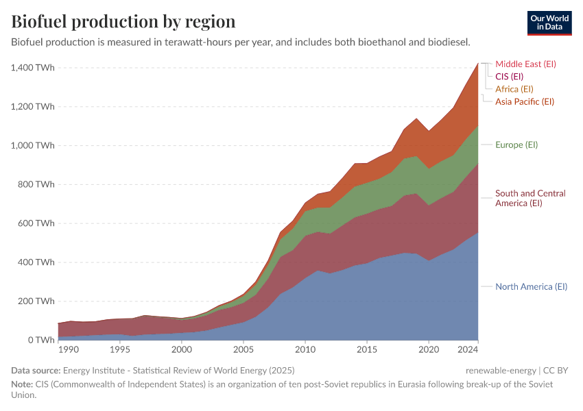 Energy Institute - Statistical Review of World Energy (2024) – with major processing by Our World in Data. “Biofuels production” [dataset]. Energy Institute, “Statistical Review of World Energy” [original data]. Retrieved June 26, 2025 from https://remove-datapage-tags.owid.pages.dev/grapher/biofuels-production-by-region