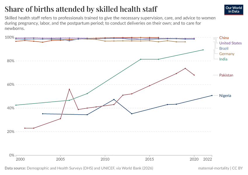 “Data Page: Share of births attended by skilled health staff”. Our World in Data (2025). Data adapted from Demographic and Health Surveys (DHS) and UNICEF, via World Bank. Retrieved from https://remove-datapage-tags.owid.pages.dev/grapher/births-attended-by-health-staff-sdgs [online resource]How to cite this data